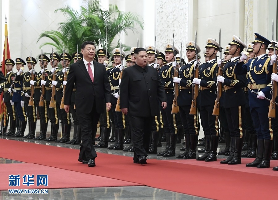 1月8日,中共中央總書記、國家主席習(xí)近平同當(dāng)日抵京的朝鮮勞動黨委員長、國務(wù)委員會委員長金正恩舉行會談。會談前,習(xí)近平在人民大會堂北大廳為金正恩舉行歡迎儀式。 新華社記者 申宏 攝