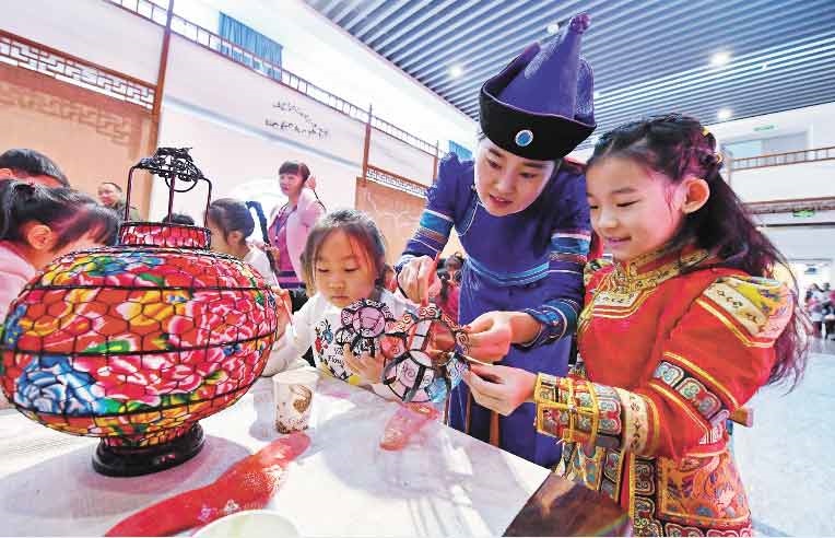 1月15日,小朋友們?cè)诜沁z年貨展互動(dòng)體驗(yàn)區(qū)學(xué)習(xí)制作燈籠。當(dāng)日,“非遺過(guò)大年文化進(jìn)萬(wàn)家——2019年全區(qū)非物質(zhì)文化遺產(chǎn)年貨展”在內(nèi)蒙古展覽館舉辦,活動(dòng)日期為1月15日至24日。本次展覽精選了與傳統(tǒng)年俗有關(guān)的近100個(gè)非遺項(xiàng)目進(jìn)行集中展示,旨在推動(dòng)非物質(zhì)文化遺產(chǎn)創(chuàng)造性轉(zhuǎn)化、創(chuàng)新性發(fā)展,促進(jìn)文化脫貧攻堅(jiān),傳承和弘揚(yáng)民族優(yōu)秀傳統(tǒng)文化,將非遺融入傳統(tǒng)新春佳節(jié),讓記憶里的濃濃年味在非遺傳統(tǒng)中鮮活起來(lái)。(內(nèi)蒙古日?qǐng)?bào)社融媒體記者 王磊攝)
