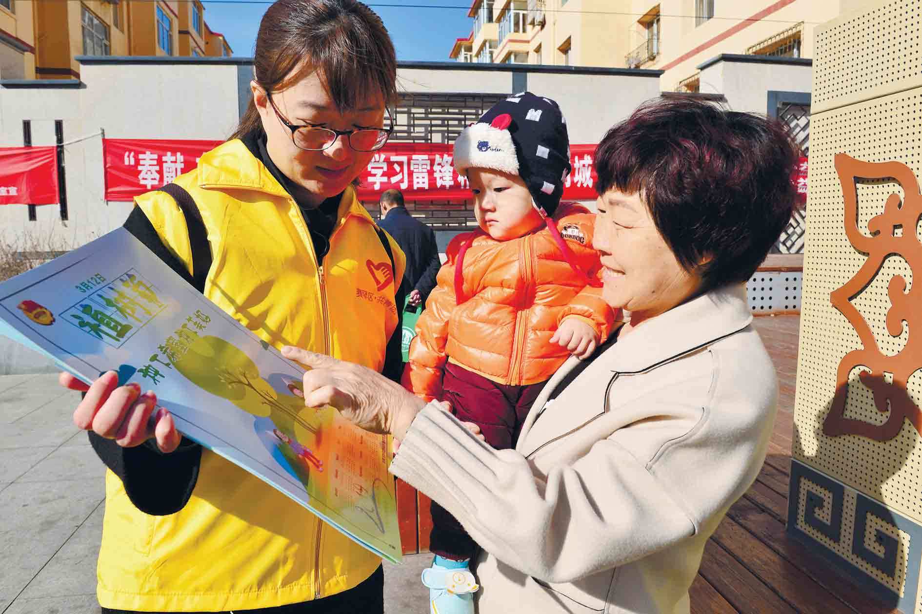 3月12日,志愿者在呼和浩特市賽罕區(qū)金地文化廣場(chǎng)上為市民發(fā)放宣傳資料。當(dāng)日,賽罕區(qū)綠化委員會(huì)辦公室舉辦了“3·12植樹節(jié)”宣傳活動(dòng)。據(jù)悉,2018年賽罕區(qū)完成植樹958萬株(叢),人均公園綠地面積19.1平方米,建成區(qū)綠化覆蓋率42.3%。(內(nèi)蒙古日?qǐng)?bào)社融媒體記者 安寅東)