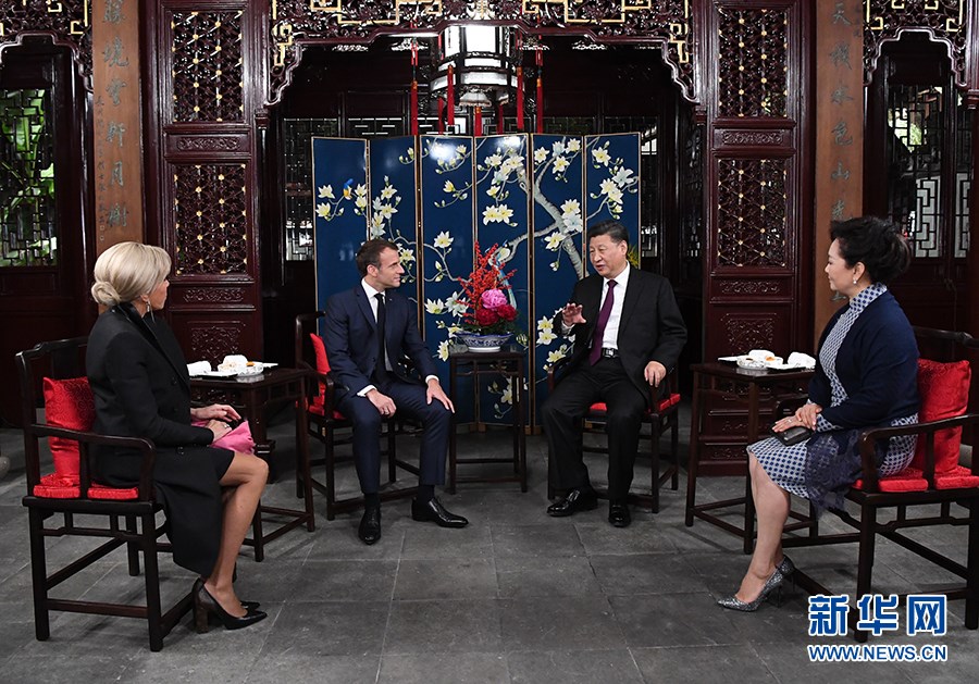 兩國元首夫婦在玉華堂落座。習近平和彭麗媛愉快地憶及今年3月訪問法國受到馬克龍夫婦熱情款待的情景。習近平說,歡迎馬克龍總統(tǒng)再次訪華并第一次來上海。上海是中國改革開放和發(fā)展進步的縮影,體現(xiàn)了近代以來中國同世界關(guān)系的演變。希望這次訪問有助于你了解上海、了解中國。我和夫人選擇在豫園款待總統(tǒng)先生和夫人,希望你們能領(lǐng)略中華園林之美和中國的傳統(tǒng)文化。文化藝術(shù)表現(xiàn)形式不同,但帶給不同國家民眾的心靈體驗是相通的,不同文化可以和諧共生。中法作為東西方兩大文明代表,應(yīng)該相互尊重,交流互鑒,各美其美,美美與共。