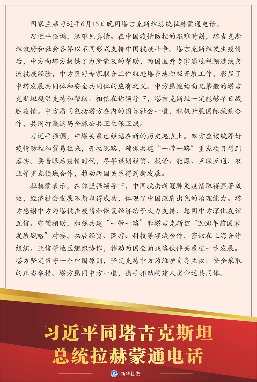 習(xí)近平強(qiáng)調(diào),患難見真情。在中國疫情防控的艱難時刻,塔吉克斯坦政府和社會各界以不同形式支持中國抗疫斗爭。塔吉克斯坦發(fā)生疫情后,中方向塔方提供了力所能及的幫助,兩國醫(yī)療專家通過視頻連線交流抗疫經(jīng)驗,中方醫(yī)療專家聯(lián)合工作組赴塔多地積極開展工作,彰顯了中塔發(fā)展共同體和安全共同體的應(yīng)有之義。中方愿繼續(xù)向兄弟般的塔吉克斯坦提供支持和幫助。相信在你領(lǐng)導(dǎo)下,塔吉克斯坦一定能夠早日戰(zhàn)勝疫情。中方愿同包括塔方在內(nèi)的國際社會一道,積極開展國際抗疫合作,共同打贏這場全球公共衛(wèi)生保衛(wèi)戰(zhàn)。