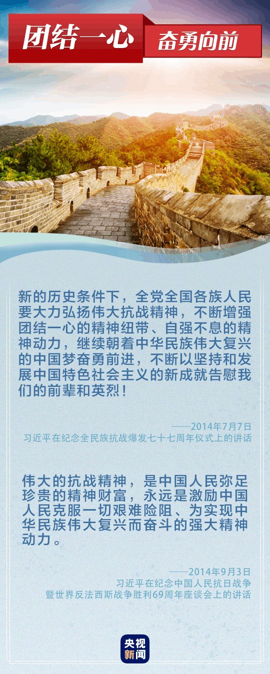 “偉大的抗戰(zhàn)精神,永遠是激勵中國人民克服一切艱難險阻、為實現(xiàn)中華民族偉大復(fù)興而奮斗的強大精神動力?!薄罢x必勝!和平必勝!人民必勝!”黨的十八大以來,習近平總書記多次談到抗戰(zhàn)精神。讓我們重溫總書記重要論述,銘記歷史、奮勇向前。