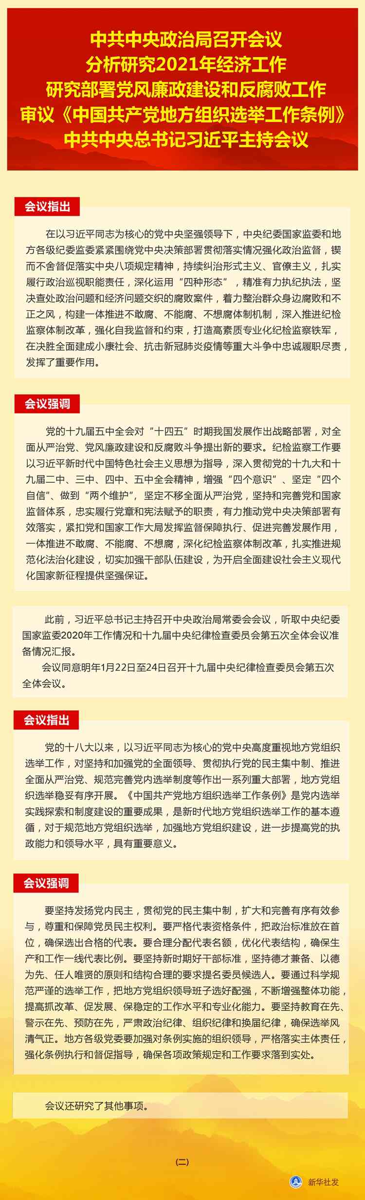 新華社北京12月11日電 中共中央政治局12月11日召開會(huì)議,分析研究2021年經(jīng)濟(jì)工作;聽取中央紀(jì)委國家監(jiān)委工作匯報(bào),研究部署2021年黨風(fēng)廉政建設(shè)和反腐敗工作;審議《中國共產(chǎn)黨地方組織選舉工作條例》。中共中央總書記習(xí)近平主持會(huì)議。