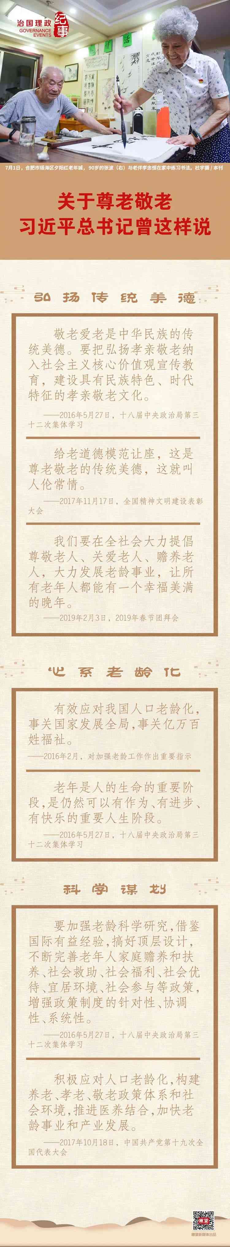 “古人講,‘夫孝,德之本也’。自古以來(lái),中國(guó)人就提倡孝老愛(ài)親,倡導(dǎo)老吾老以及人之老、幼吾幼以及人之幼。我國(guó)已經(jīng)進(jìn)入老齡化社會(huì)。讓老年人老有所養(yǎng)、老有所依、老有所樂(lè)、老有所安,關(guān)系社會(huì)和諧穩(wěn)定?!?019年春節(jié)團(tuán)拜會(huì)上,習(xí)近平總書(shū)記這樣講述他心中的“孝”與尊老敬老傳統(tǒng)美德。