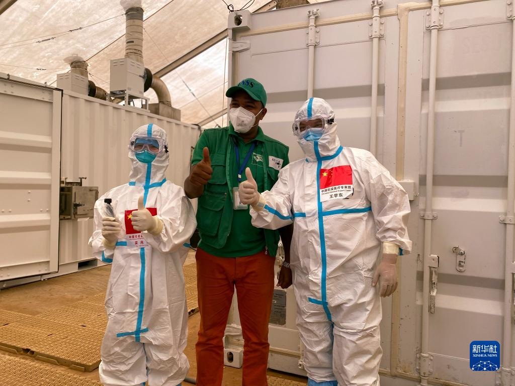 2020年9月2日,在幾內(nèi)亞首都科納克里一個核酸檢測取樣點,中國抗疫醫(yī)療專家組成員與當?shù)毓ぷ魅藛T合影。新華社發(fā)(專家組供圖)