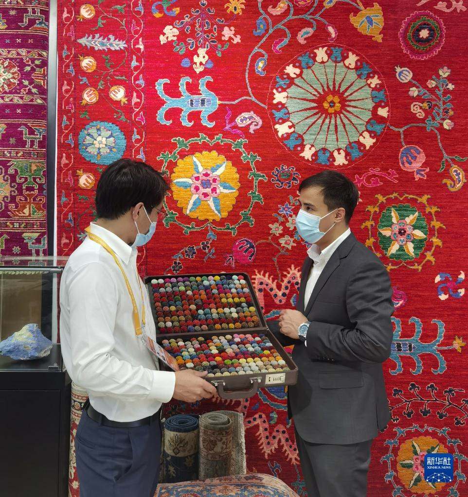 上海南京路步行街,進(jìn)博集市,阿富汗地毯商阿里正忙著向消費者展示阿富汗手工地毯。