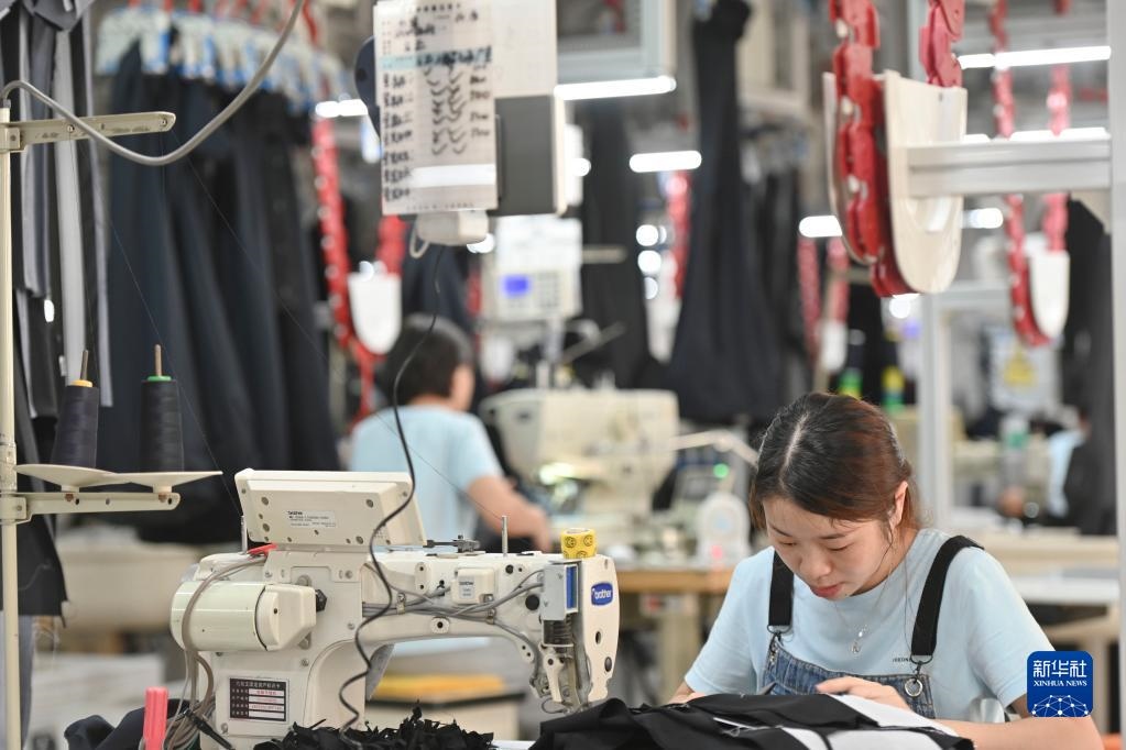 在位于福建省泉州市經(jīng)濟(jì)技術(shù)開發(fā)區(qū)的九牧王西褲智能化生產(chǎn)車間,工人在自動化西褲吊掛流水線上作業(yè)(7月30日攝)。新華社記者宋為偉攝