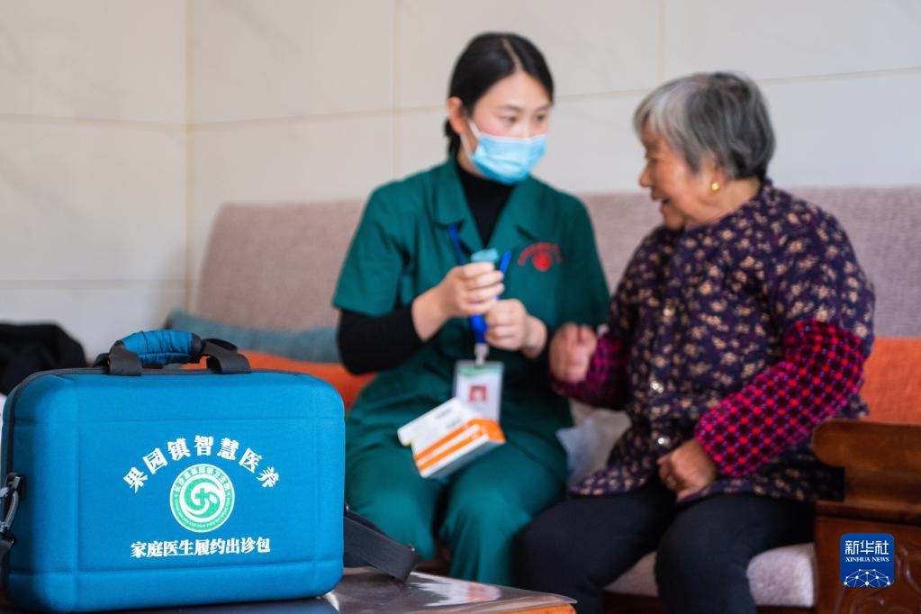 11月12日,在湖南省長沙市長沙縣果園鎮(zhèn)楊泗廟社區(qū),醫(yī)務(wù)人員劉敏指導(dǎo)居家老人用藥。新華社記者陳思汗攝