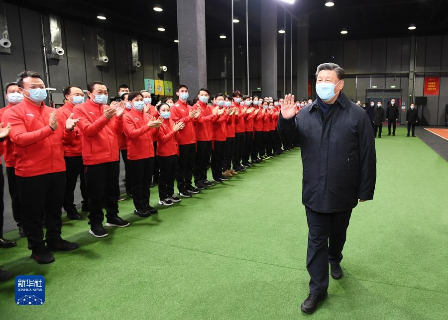1月4日,中共中央總書記、國家主席、中央軍委主席習近平在北京考察2022年冬奧會、冬殘奧會籌辦備賽工作。這是4日下午,習近平在二七廠冰雪項目訓(xùn)練基地專項體能訓(xùn)練館,向運動員、教練員、服務(wù)保障人員揮手致意。新華社記者 謝環(huán)馳 攝