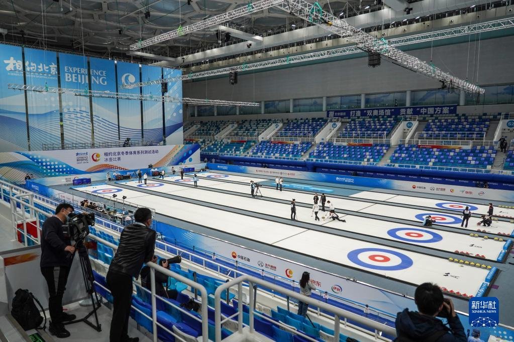 2021年4月6日,運(yùn)動(dòng)員在冰壺項(xiàng)目測(cè)試活動(dòng)中。2022年北京冬奧會(huì)將國(guó)家游泳中心“水立方”改造為“冰立方”,用作冰壺項(xiàng)目比賽場(chǎng)館,有效減少建設(shè)投資,更讓夏奧場(chǎng)館煥然新生,拓展多元賽后經(jīng)營(yíng)能力。新華社記者彭子洋攝