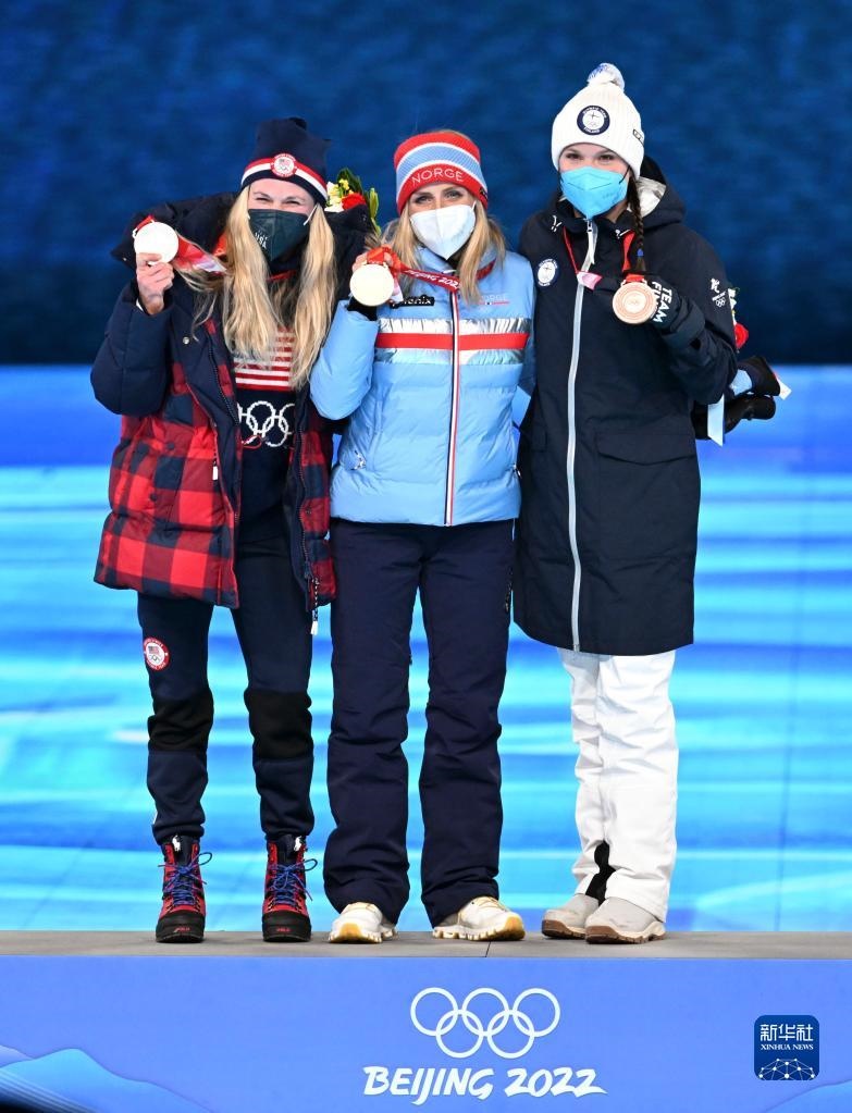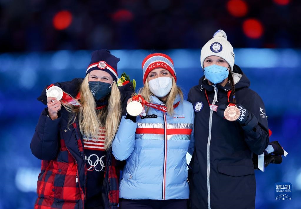 這是越野滑雪女子30公里集體出發(fā)(自由技術(shù))冠軍挪威選手特蕾絲·約海于格(中)、亞軍美國(guó)選手杰茜·迪金斯(左)和季軍芬蘭選手凱爾圖·尼斯卡寧在獎(jiǎng)牌頒發(fā)儀式上。