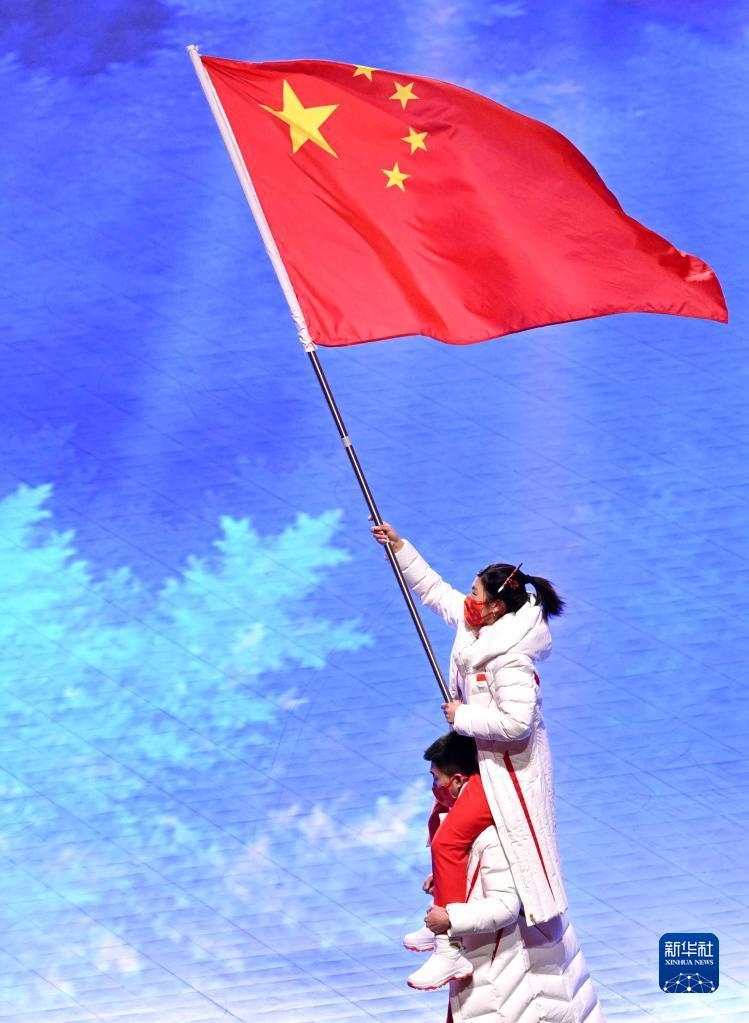 這是中國(guó)代表團(tuán)旗手徐夢(mèng)桃與高亭宇在閉幕式上入場(chǎng)。