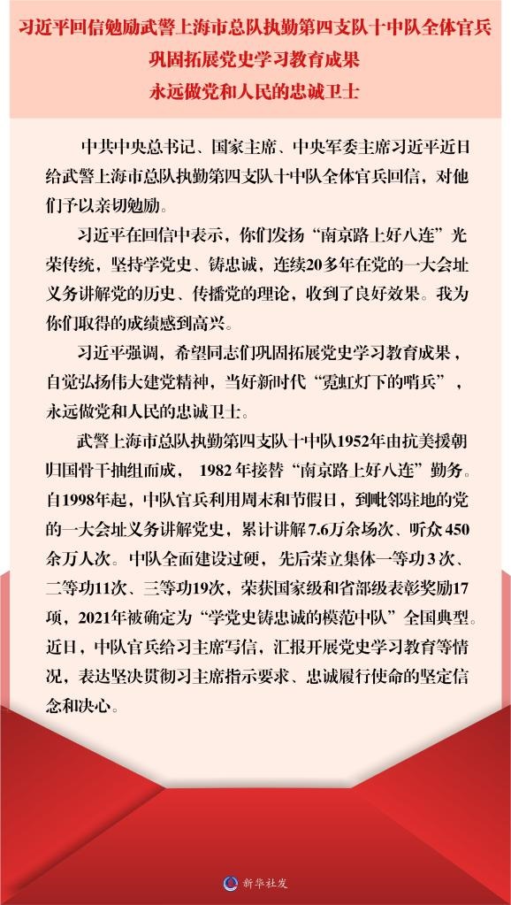 武警上海市總隊執(zhí)勤第四支隊十中隊1952年由抗美援朝歸國骨干抽組而成,1982年接替“南京路上好八連”勤務(wù)。自1998年起,中隊官兵利用周末和節(jié)假日,到毗鄰駐地的黨的一大會址義務(wù)講解黨史,累計講解7.6萬余場次、聽眾450余萬人次。中隊全面建設(shè)過硬,先后榮立集體一等功3次、二等功11次、三等功19次,榮獲國家級和省部級表彰獎勵17項,2021年被確定為“學(xué)黨史鑄忠誠的模范中隊”全國典型。近日,中隊官兵給習(xí)主席寫信,匯報開展黨史學(xué)習(xí)教育等情況,表達堅決貫徹習(xí)主席指示要求、忠誠履行使命的堅定信念和決心。