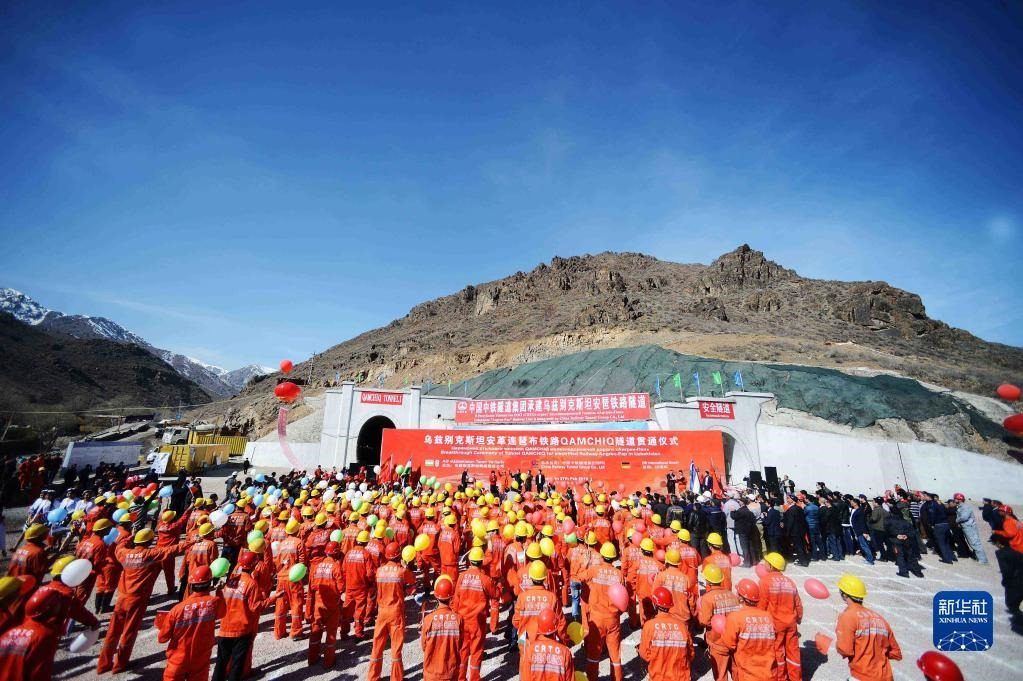 這是2016年2月27日在烏茲別克斯坦“安格連-帕普”鐵路卡姆奇克隧道出口拍攝的全隧貫通儀式現(xiàn)場(chǎng)。新華社記者 沙達(dá)提 攝