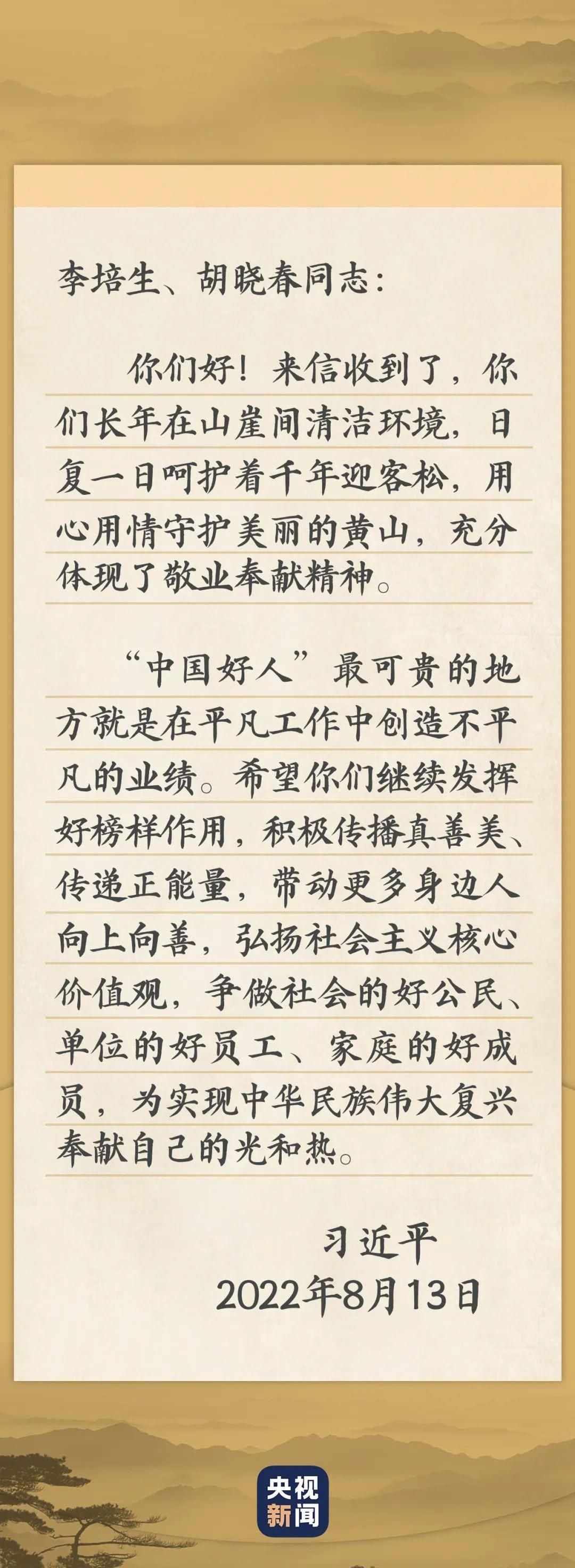 “真沒有想到習(xí)近平總書記給我們回信了,這份巨大的鼓舞不僅是給我們倆,也是給黃山的,更是給所有‘中國好人’的。”接到書信的李培生和胡曉春,前行的動(dòng)力十足。