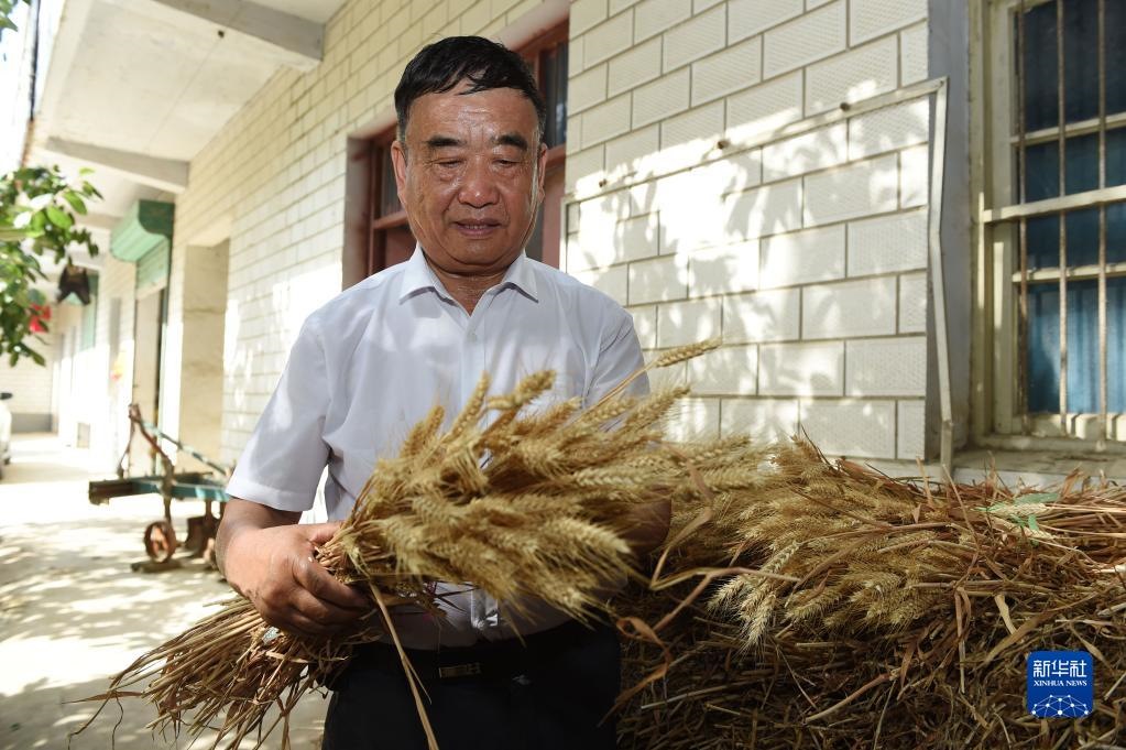 2022年6月28日,徐淙祥在安徽太和縣淙祥現(xiàn)代農(nóng)業(yè)種植專(zhuān)業(yè)合作社察看小麥樣品。新華社記者 周牧 攝