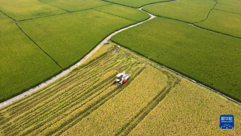 2022年9月28日,合肥市肥西縣花崗鎮(zhèn)河豐社區(qū)村民駕駛收割機(jī)收獲中稻(無(wú)人機(jī)照片)。新華社發(fā)(徐勇攝)