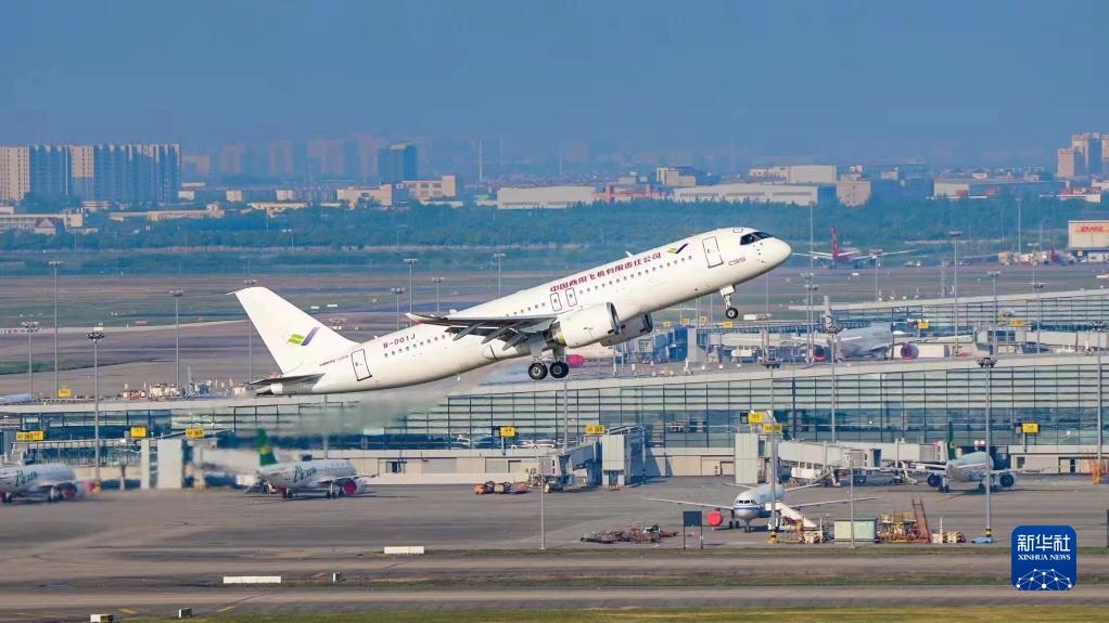 2022年5月14日6時(shí)52分,編號(hào)為B-001J的C919大飛機(jī)從上海浦東機(jī)場(chǎng)第4跑道起飛,于9時(shí)54分安全降落,標(biāo)志著中國(guó)商飛公司即將交付首家用戶(hù)的首架C919大飛機(jī)首次飛行試驗(yàn)圓滿(mǎn)完成。新華社發(fā)