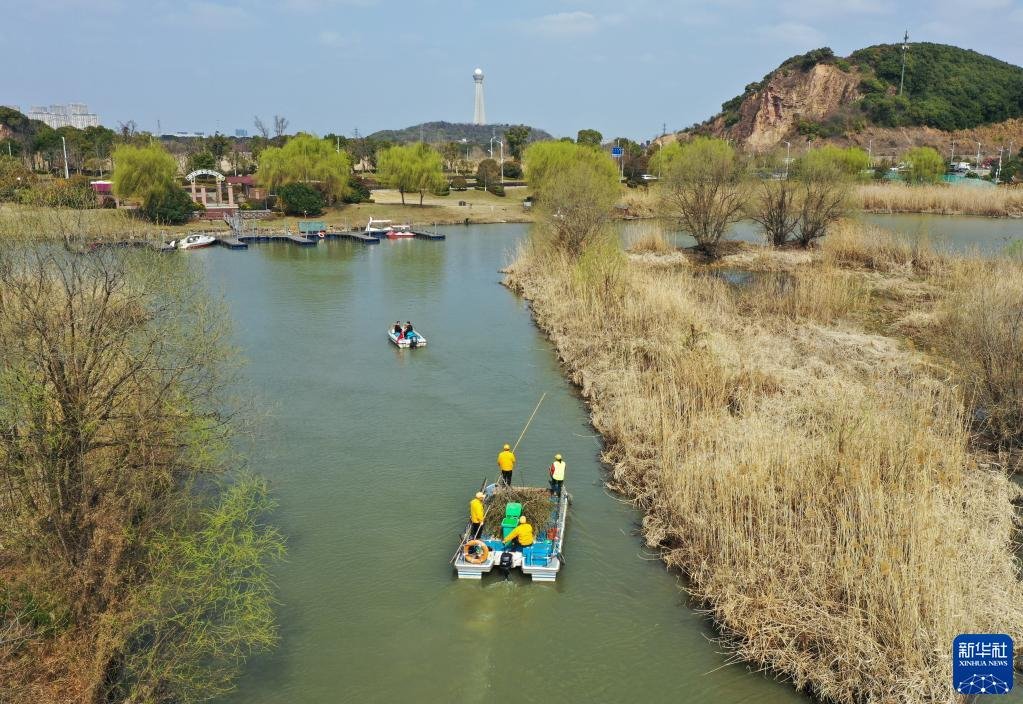 浙江省湖州市吳興區(qū)八里店鎮(zhèn)移沿山村河長帶隊(duì)在移沿山村開展巡河、保潔作業(yè)(2021年2月24日攝,無人機(jī)照片)。新華社記者 翁忻旸 攝