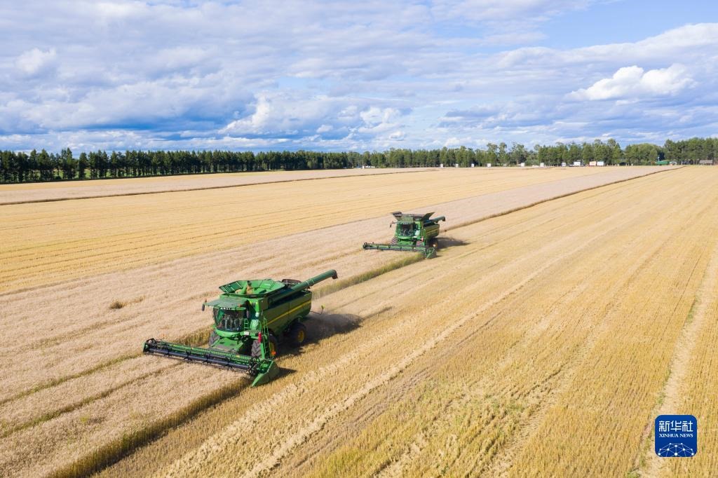 聯(lián)合收割機(jī)在黑龍江北大荒集團(tuán)紅星農(nóng)場(chǎng)有限公司田間收獲小麥(2022年8月10日攝,無(wú)人機(jī)照片)。新華社記者 謝劍飛 攝