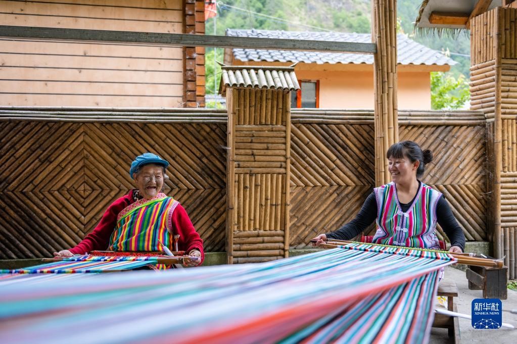 在云南省貢山獨(dú)龍族怒族自治縣獨(dú)龍江鄉(xiāng)迪政當(dāng)村,獨(dú)龍族老人李文仕(左)和女兒在編織獨(dú)龍?zhí)海?022年5月10日攝)。新華社記者 曹夢(mèng)瑤 攝