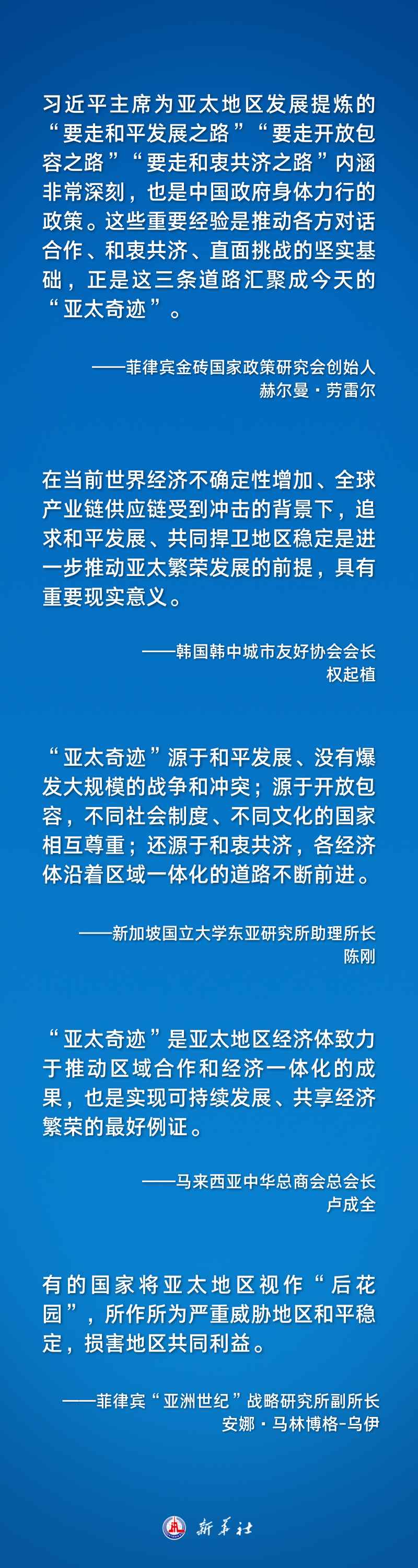 對于亞太未來發(fā)展繁榮,習(xí)近平主席提出重要主張:要攜手構(gòu)建亞太命運共同體,再創(chuàng)亞太合作新輝煌。多國人士認為,“維護國際公平正義,建設(shè)和平穩(wěn)定的亞太”“堅持開放包容,建設(shè)共同富裕的亞太”“堅持綠色低碳發(fā)展,建設(shè)清潔美麗的亞太”“堅持命運與共,建設(shè)守望相助的亞太”為亞太地區(qū)未來發(fā)展指明了方向和路徑。