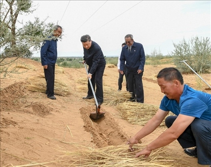△2019年8月21日,正在甘肅考察的習(xí)近平總書記來到古浪縣八步沙林場(chǎng)??疾熘校闷鹨话验_溝犁,參與到治沙勞動(dòng)中。