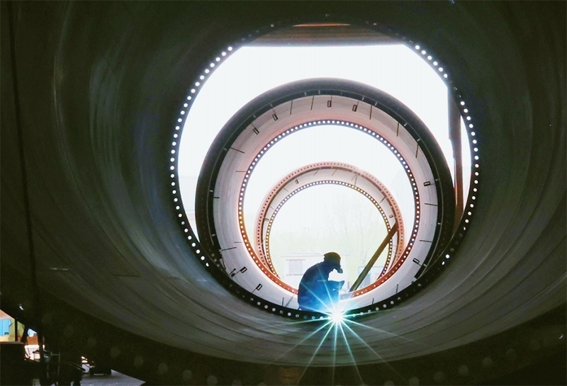 2023年一季度,我國國內(nèi)生產(chǎn)總值同比增長4.5%,國民經(jīng)濟(jì)開局良好,為實(shí)現(xiàn)全年發(fā)展目標(biāo)奠定了基礎(chǔ),注入了信心。圖為2023年4月18日,工人在江蘇連云港經(jīng)濟(jì)技術(shù)開發(fā)區(qū)一家公司內(nèi)加工組裝風(fēng)電塔筒。 中新社發(fā) 耿玉和/攝