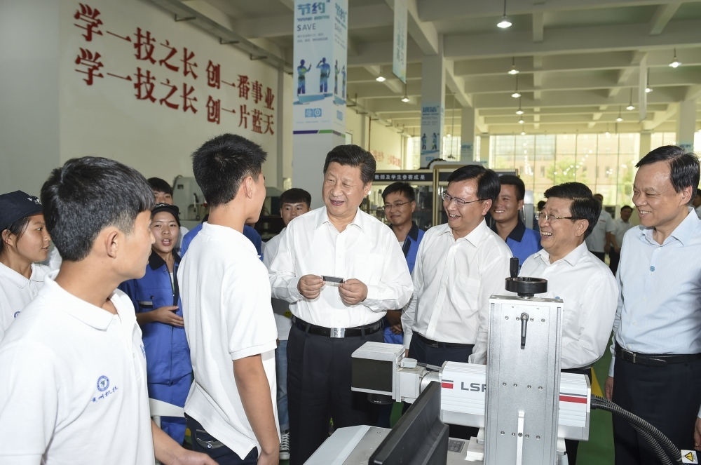 2015年6月17日,習(xí)近平在貴州省機(jī)械工業(yè)學(xué)校實(shí)訓(xùn)基地勉勵(lì)學(xué)生加強(qiáng)操作訓(xùn)練、不斷取得優(yōu)異成績(jī)。