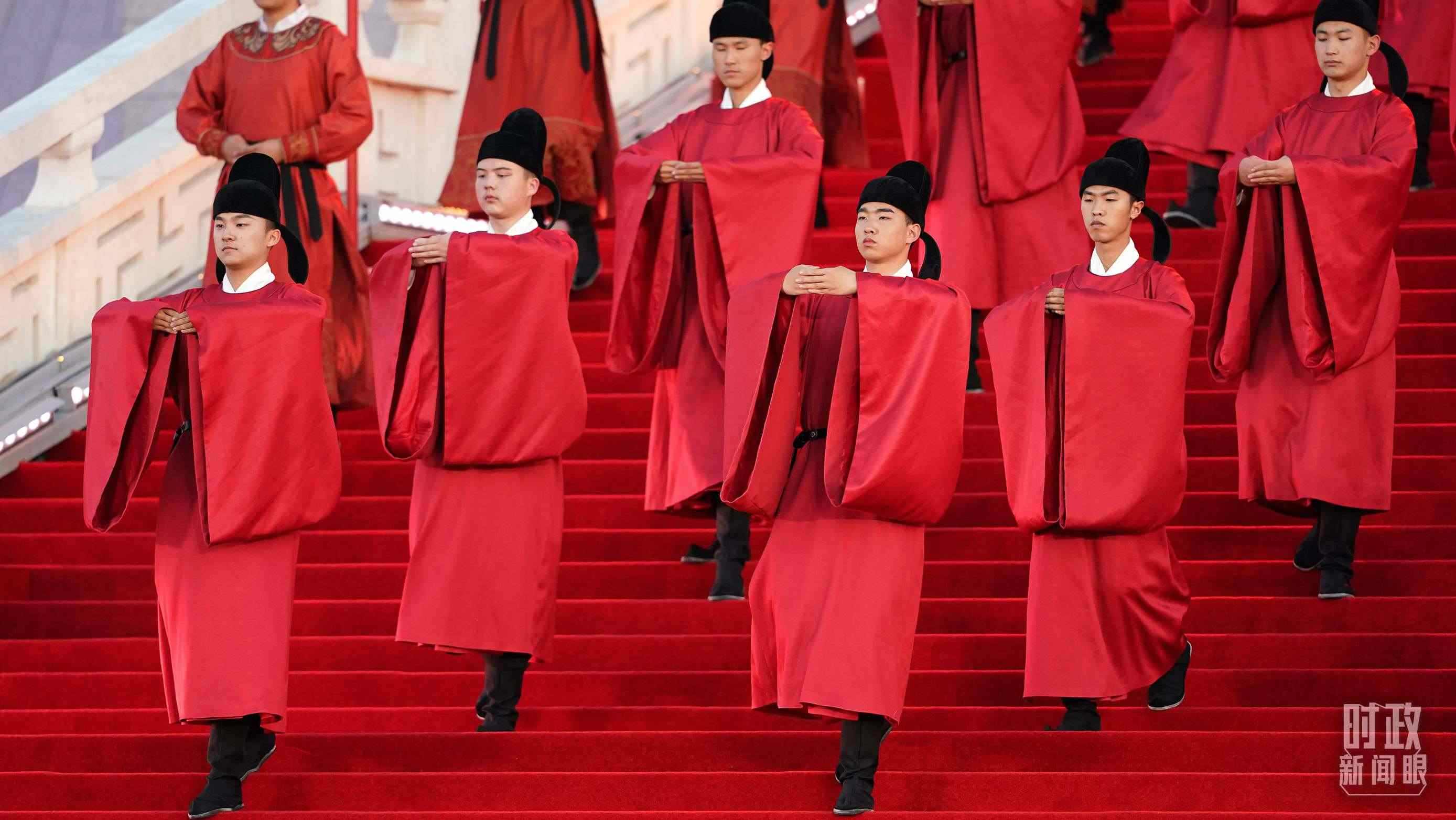 比如,迎賓表演中身著唐代紅色官服的男子,雙手平伸,指尖交錯,左手在外,掌心向內(nèi),舉手至額,欠身行禮,以中國傳統(tǒng)的“天揖禮”表達(dá)對賓客的敬意。
