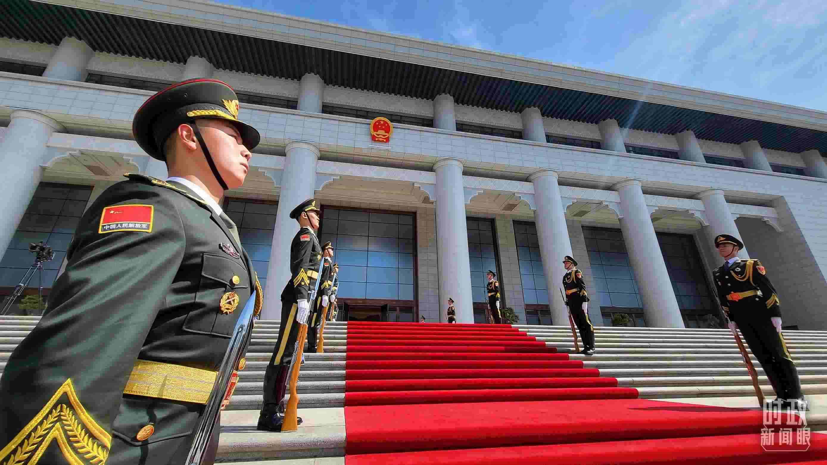 △陜西賓館會議中心外,禮兵列隊(duì)迎接貴賓。(總臺央視記者鐘信偉拍攝)