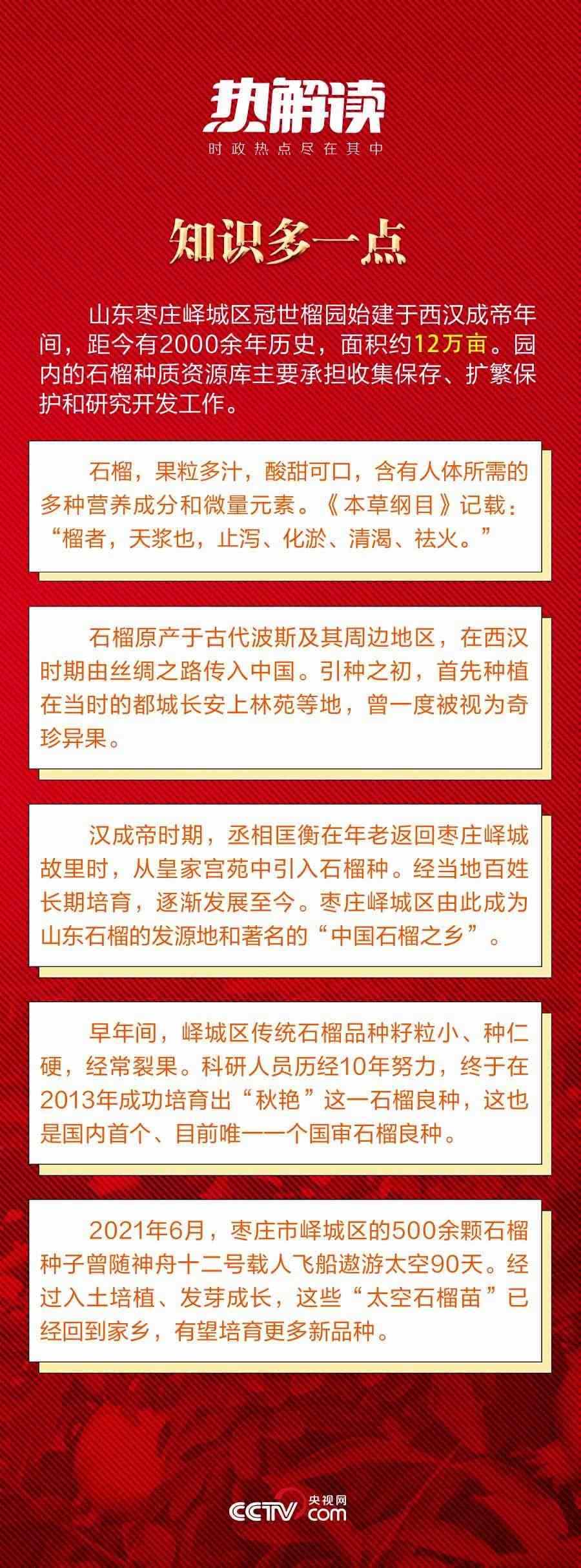 歷經(jīng)千年,當(dāng)年自異域“舶來”的奇珍異果,已經(jīng)成為遍地開花的致富果、幸福果。山東棗莊火紅的石榴給這座小城帶來了紅火的發(fā)展機遇,也給老百姓帶來了紅火的生活。
