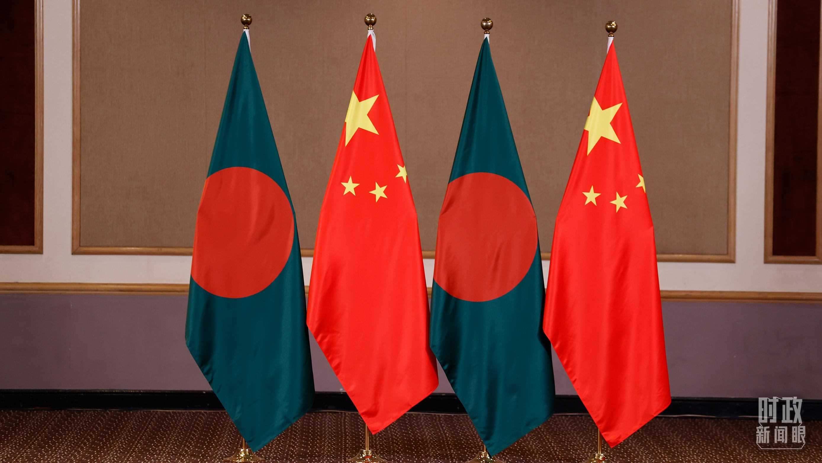 △會(huì)見(jiàn)現(xiàn)場(chǎng)的中孟兩國(guó)國(guó)旗。(總臺(tái)央視記者耿小龍拍攝)