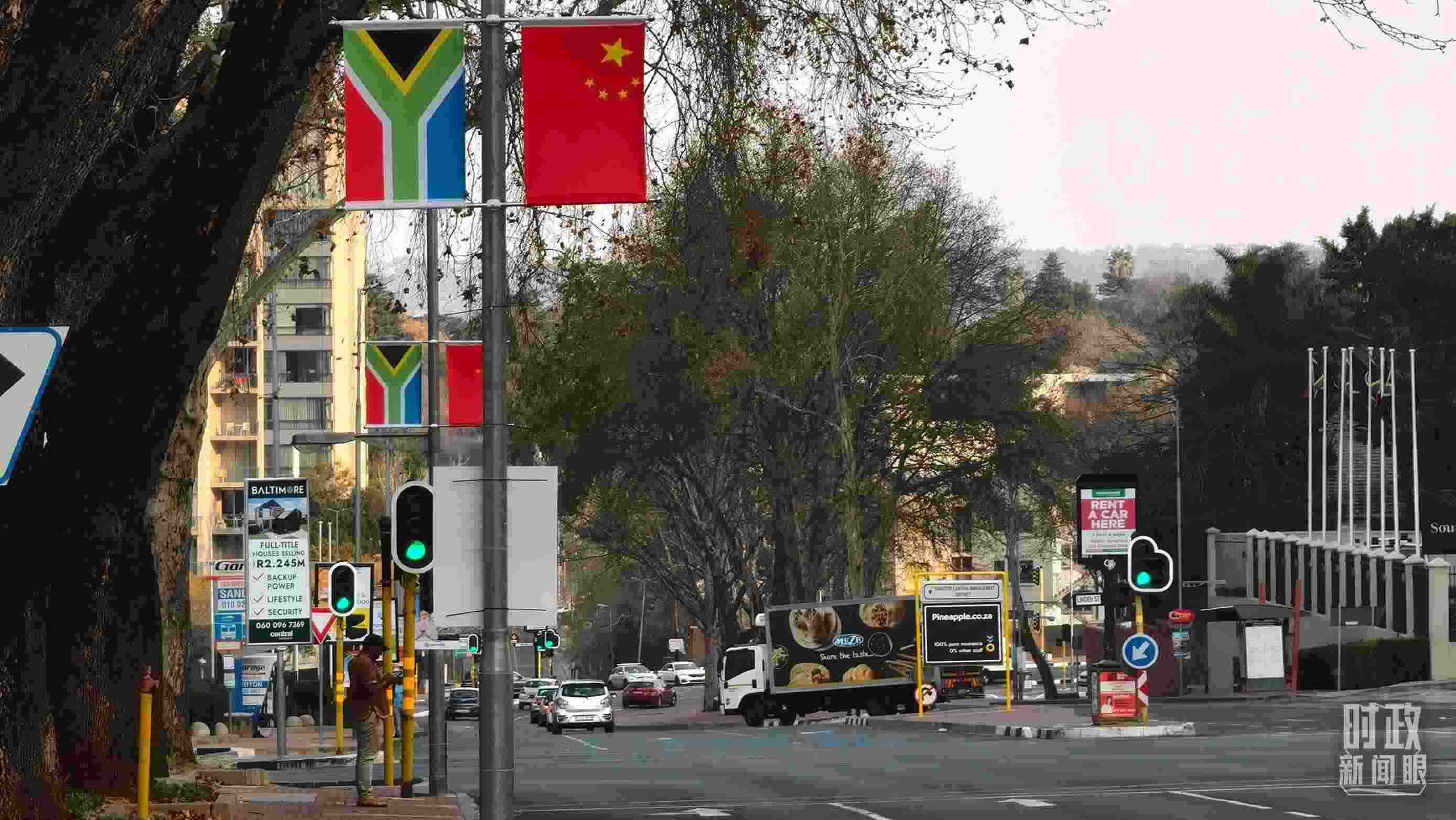△約翰內(nèi)斯堡街道兩側(cè)懸掛的中國(guó)國(guó)旗。(總臺(tái)央視記者韓銳拍攝)