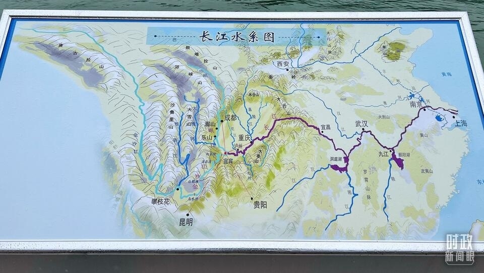 △2020年6月,習近平在四川宜賓三江口考察。圖為現(xiàn)場展出的《長江水系圖》。(總臺央視記者張宇拍攝)