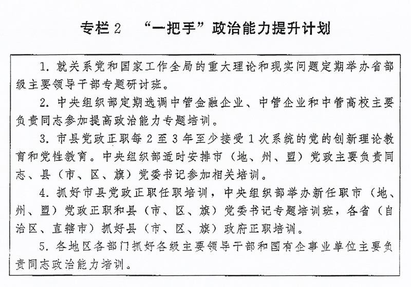 (二)突出“關(guān)鍵少數(shù)”政治訓(xùn)練。堅(jiān)持把政治訓(xùn)練貫穿干部成長全周期,使干部的政治素養(yǎng)、政治能力與擔(dān)負(fù)的領(lǐng)導(dǎo)職責(zé)相匹配。強(qiáng)化“一把手”政治培訓(xùn),有計(jì)劃地選調(diào)地方、部門、國有企事業(yè)單位主要負(fù)責(zé)同志到黨校(行政學(xué)院)、干部學(xué)院參加專題培訓(xùn)。實(shí)施“一把手”政治能力提升計(jì)劃(專欄2)。?。ㄗ灾螀^(qū)、直轄市)、市(地、州、盟)、縣(市、區(qū)、旗)黨政領(lǐng)導(dǎo)班子成員每2至3年到黨校(行政學(xué)院)、干部學(xué)院至少接受1次系統(tǒng)的黨的創(chuàng)新理論教育和黨性教育,5年內(nèi)累計(jì)不少于2個(gè)月。圍繞提高政治能力和領(lǐng)導(dǎo)能力,加強(qiáng)機(jī)關(guān)司局長、處長任職培訓(xùn)。重視對女干部、少數(shù)民族干部、黨外干部等的政治培訓(xùn)。加強(qiáng)對高層次人才的政治引領(lǐng),中央組織部會同有關(guān)單位每年組織一定數(shù)量人才開展國情研修。