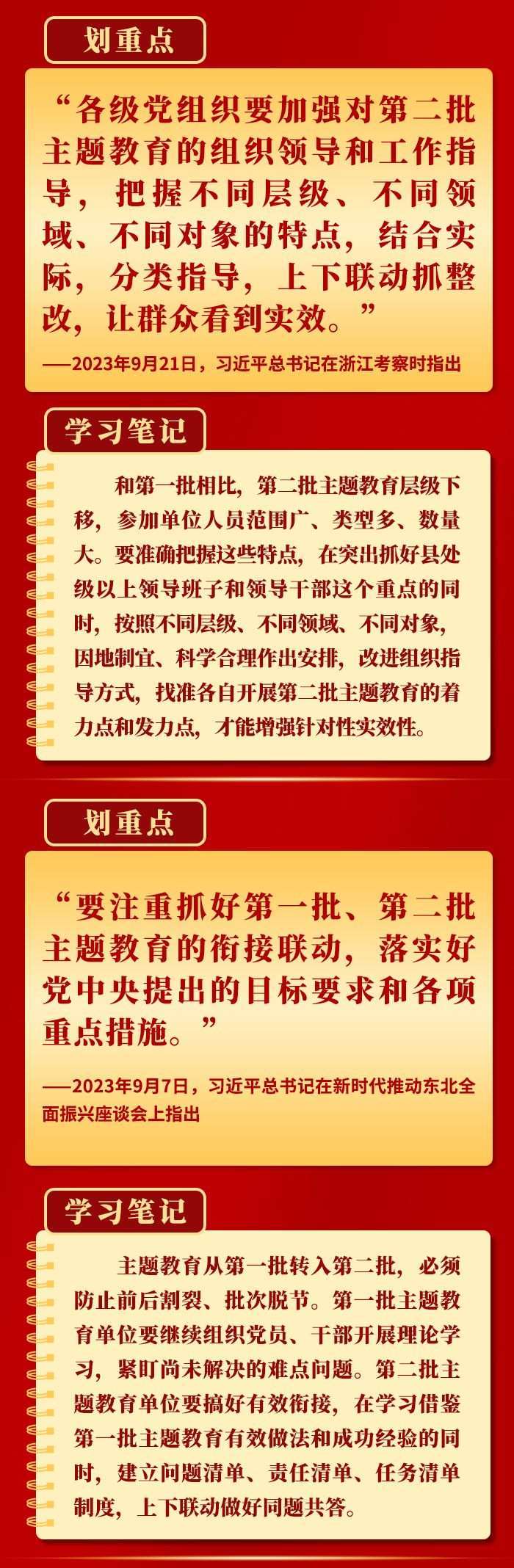 當(dāng)前,第二批學(xué)習(xí)貫徹習(xí)近平新時(shí)代中國特色社會(huì)主義思想主題教育扎實(shí)推進(jìn)。9月以來,習(xí)近平總書記在黑龍江、浙江、江西考察時(shí),對第二批主題教育工作提出明確要求,為持續(xù)開展好這件“事關(guān)全局的大事”指明方向。一起學(xué)習(xí)。