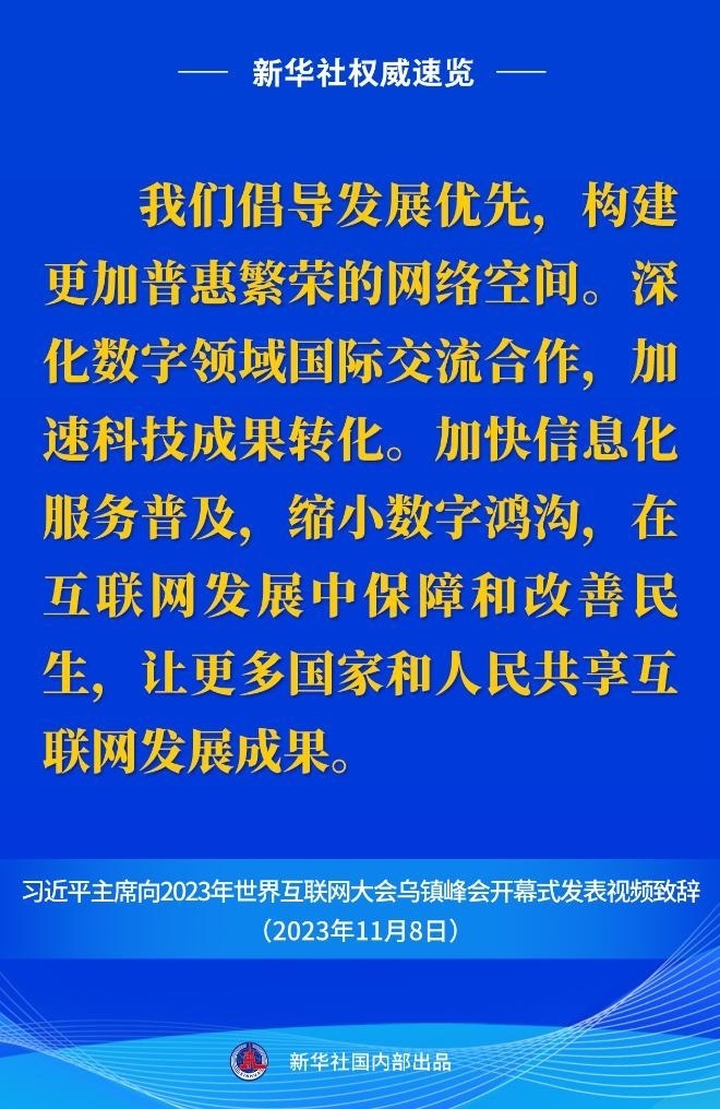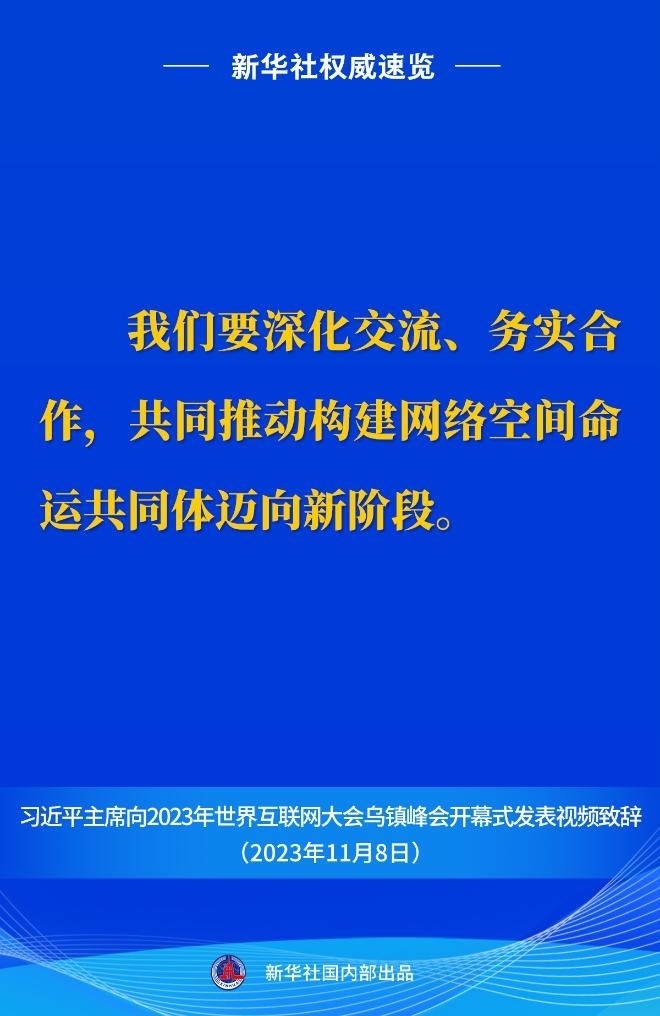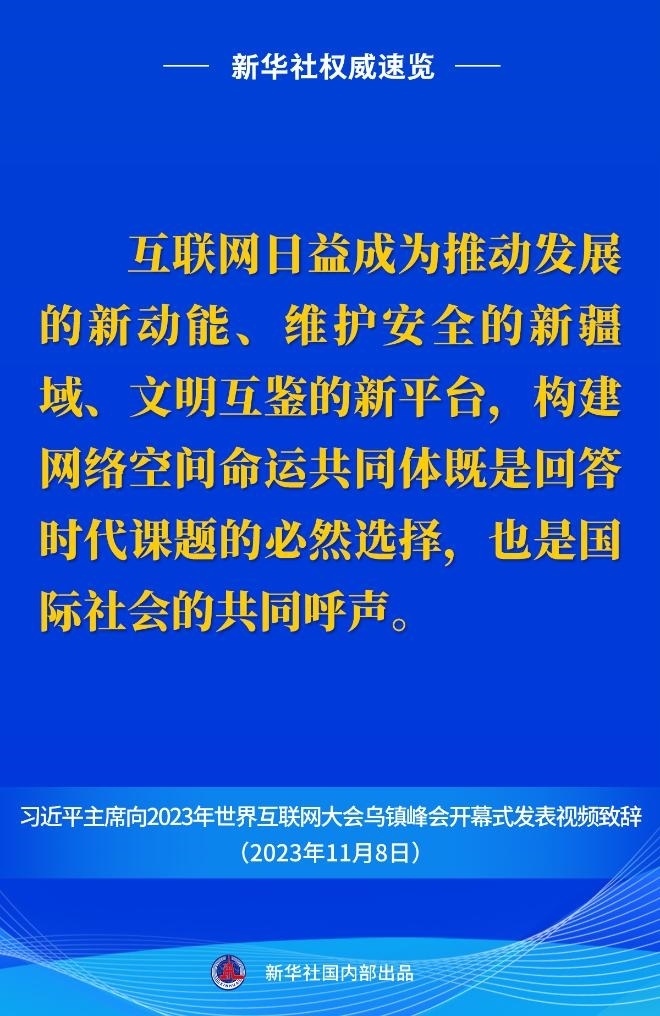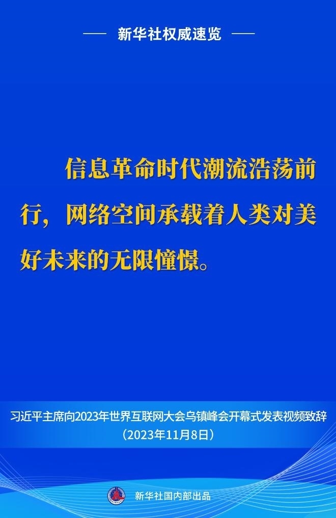 11月8日上午,國(guó)家主席習(xí)近平向2023年世界互聯(lián)網(wǎng)大會(huì)烏鎮(zhèn)峰會(huì)開幕式發(fā)表視頻致辭。一起來(lái)看金句。