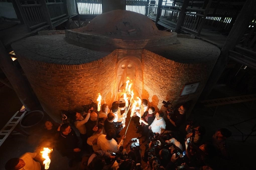 2023年10月19日,嘉賓與把樁師傅一起對葫蘆窯進行復(fù)燒點火。當(dāng)日,作為2023中國景德鎮(zhèn)國際陶瓷博覽會的活動之一,景德鎮(zhèn)古窯民俗博覽區(qū)對重建的明代葫蘆窯進行點火復(fù)燒。同時,景德鎮(zhèn)歷代瓷窯活態(tài)傳承紀(jì)實館開館。新華社記者 周密 攝