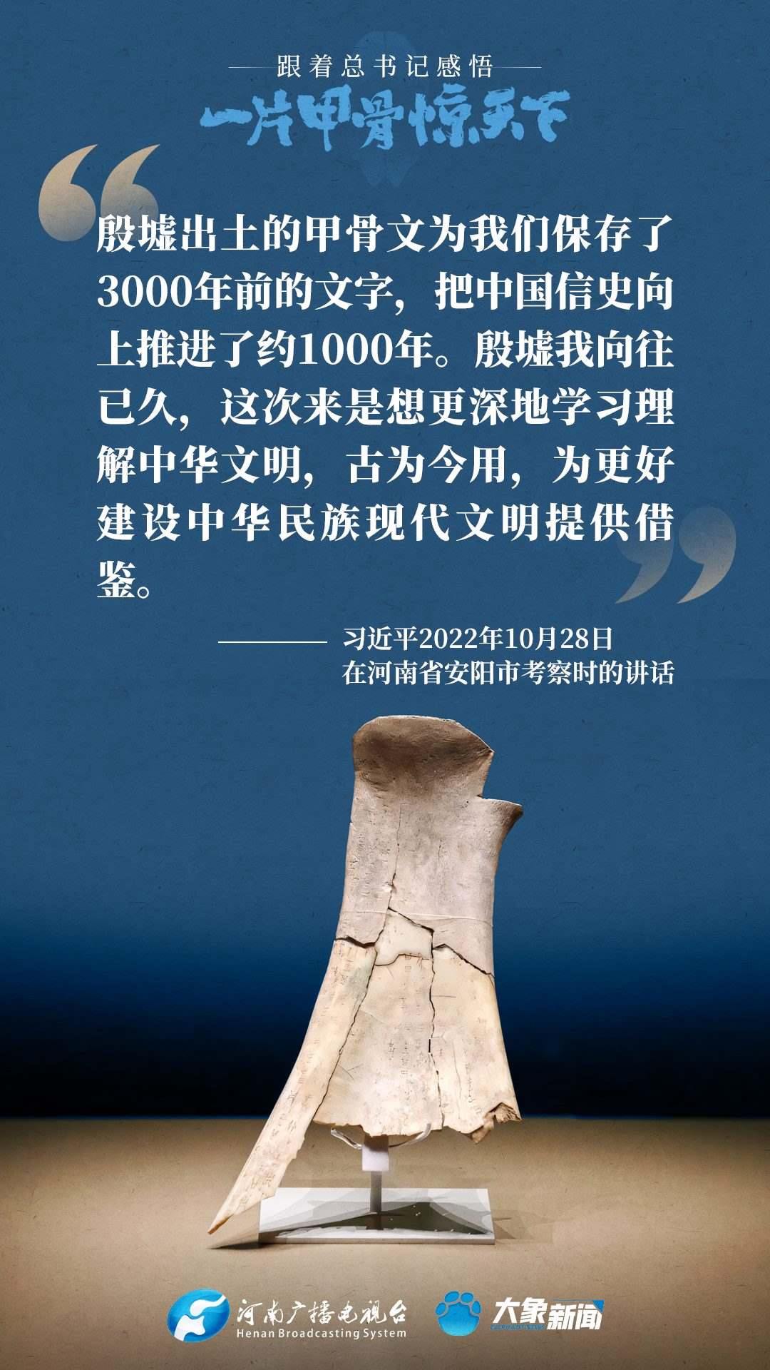 黨的十八大以來,習(xí)近平總書記多次就殷墟和甲骨文保護(hù)研究利用工作作出重要講話重要指示,為我們堅(jiān)定文化自信,傳承發(fā)展中華優(yōu)秀傳統(tǒng)文化提供了根本遵循。大象新聞邀您一起回顧、學(xué)習(xí)。