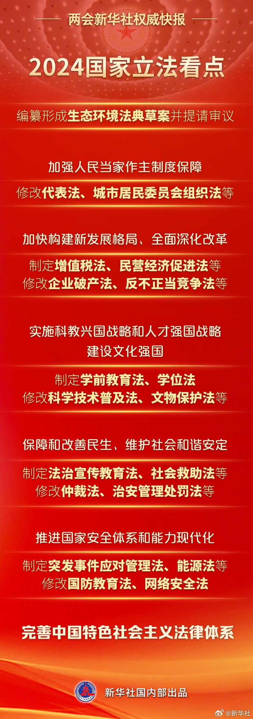 8日提請(qǐng)十四屆全國(guó)人大二次會(huì)議審議的全國(guó)人大常委會(huì)工作報(bào)告提出,2024年,要認(rèn)真落實(shí)常委會(huì)立法規(guī)劃,完善中國(guó)特色社會(huì)主義法律體系:制定民營(yíng)經(jīng)濟(jì)促進(jìn)法、學(xué)前教育法、社會(huì)救助法等,修改城市居民委員會(huì)組織法、文物保護(hù)法、網(wǎng)絡(luò)安全法等。