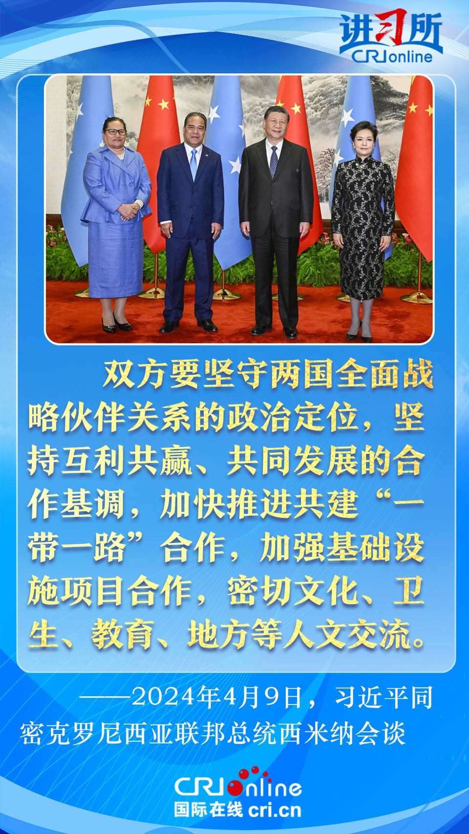 4月9日下午,中國(guó)國(guó)家主席習(xí)近平在北京同密克羅尼西亞聯(lián)邦總統(tǒng)西米納舉行會(huì)談,此訪是西米納總統(tǒng)就任以來(lái)首次訪華,兩國(guó)領(lǐng)導(dǎo)人就雙邊關(guān)系發(fā)展及共同關(guān)心的問(wèn)題深入交換意見(jiàn)。