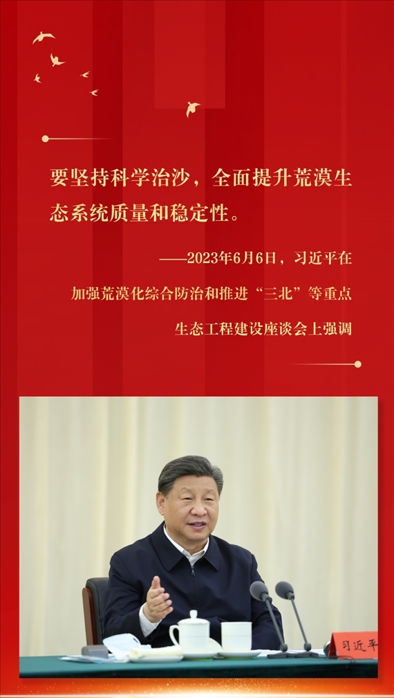 2023年6月5日至6日,習近平在內蒙古巴彥淖爾考察,并主持召開加強荒漠化綜合防治和推進“三北”等重點生態(tài)工程建設座談會。這是6日上午,習近平在臨河區(qū)國營新華林場考察。