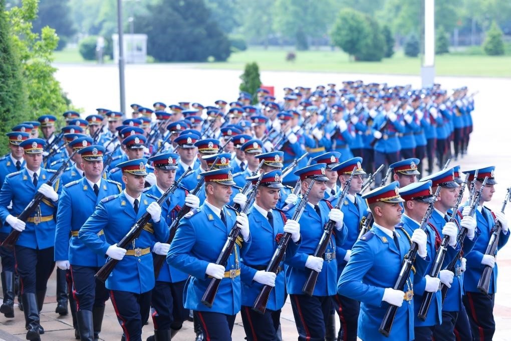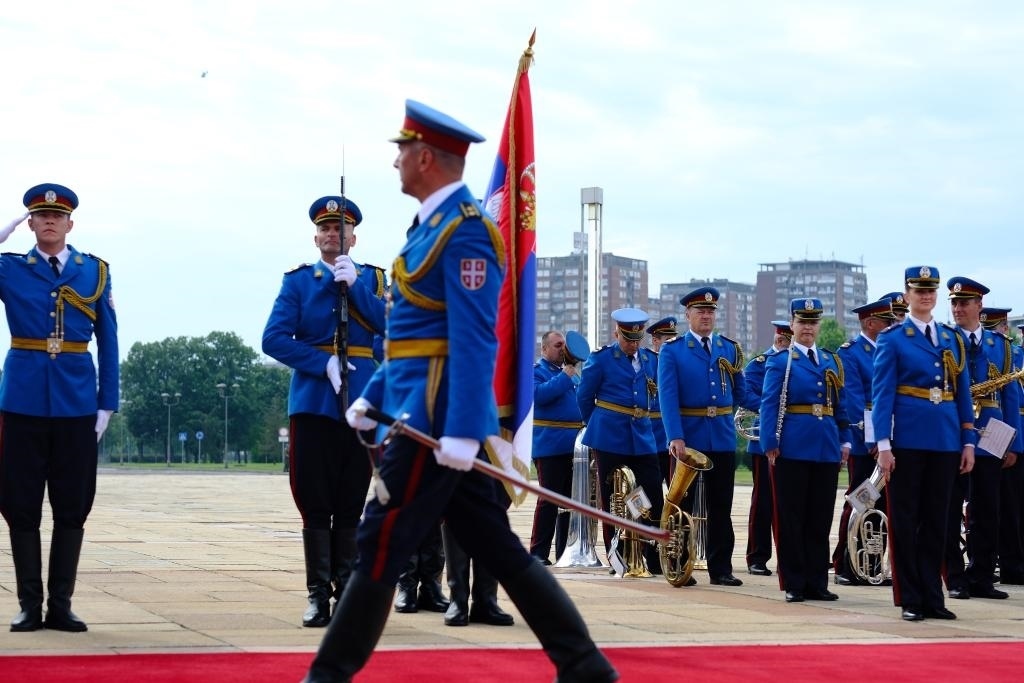 塞爾維亞大廈前,中塞兩國(guó)國(guó)旗迎風(fēng)飄揚(yáng),儀仗隊(duì)威武雄壯。