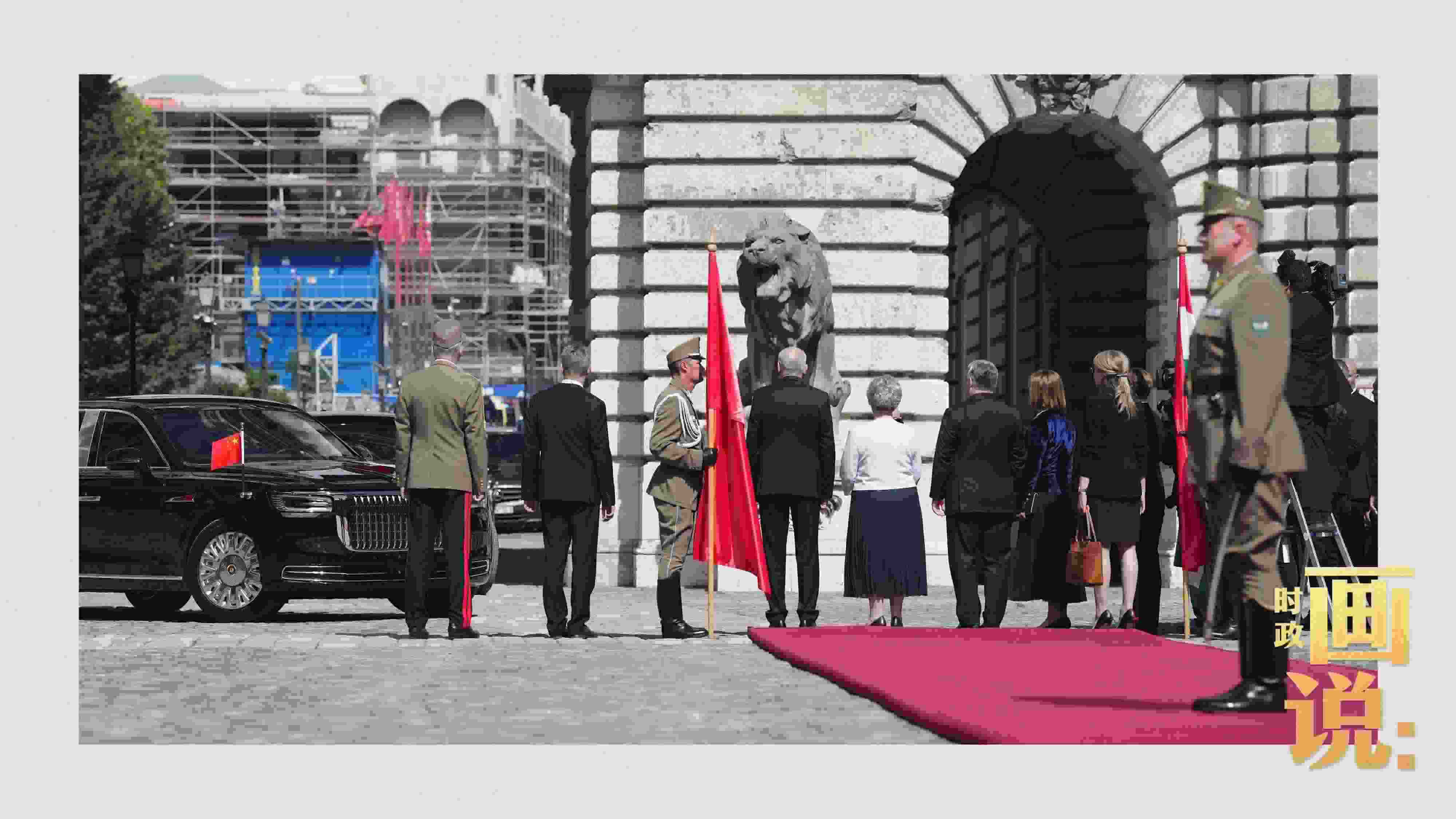 △習近平主席乘車抵達布達王宮,舒尤克總統(tǒng)夫婦和歐爾班總理夫婦在習主席下車處提前等候,熱情迎接。