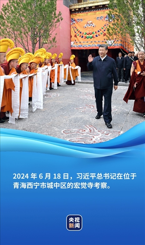 6月18日,正在青??疾斓牧?xí)近平總書記來到位于西寧市城中區(qū)的宏覺寺。在寺前院落,宏覺寺民主管理委員會負(fù)責(zé)人向總書記敬獻哈達,僧人提香爐、持寶傘迎接總書記。