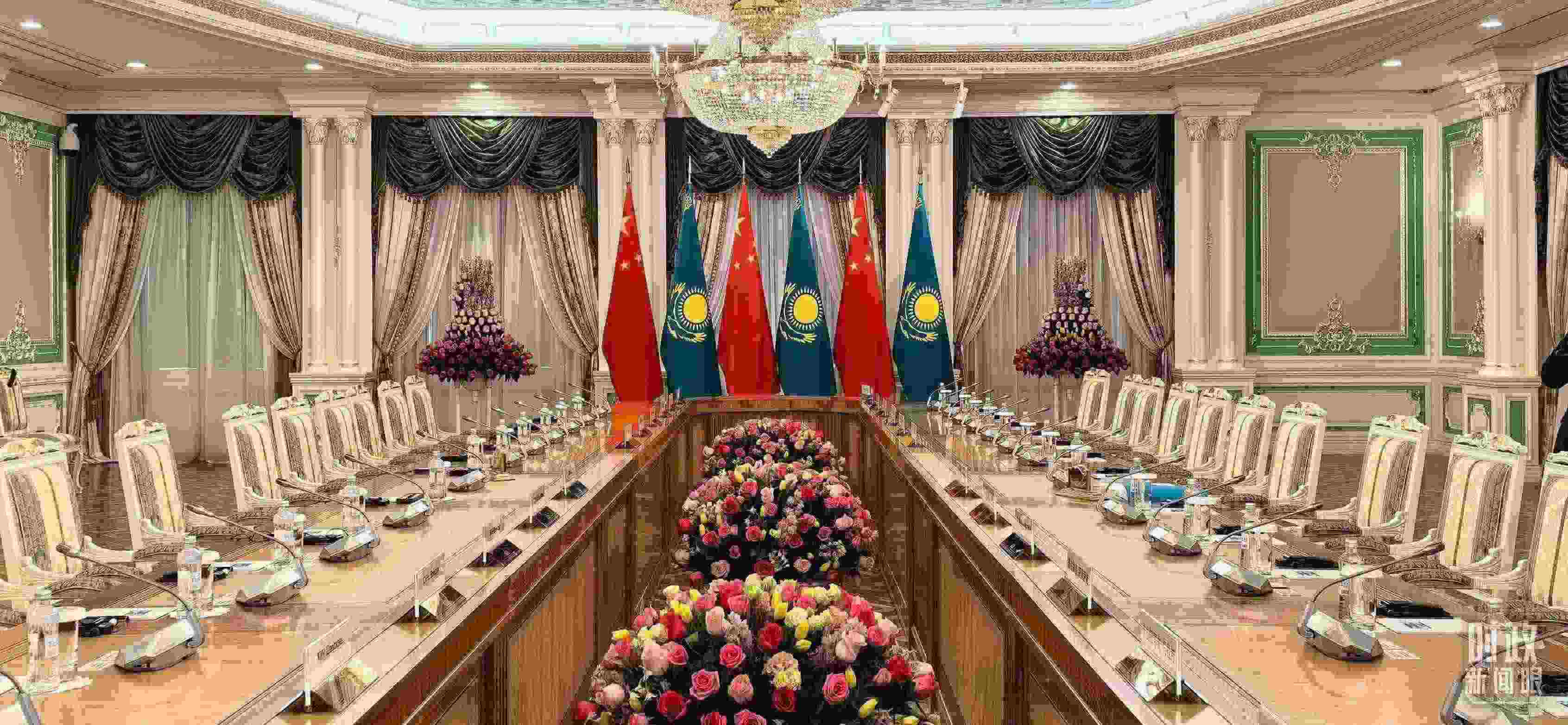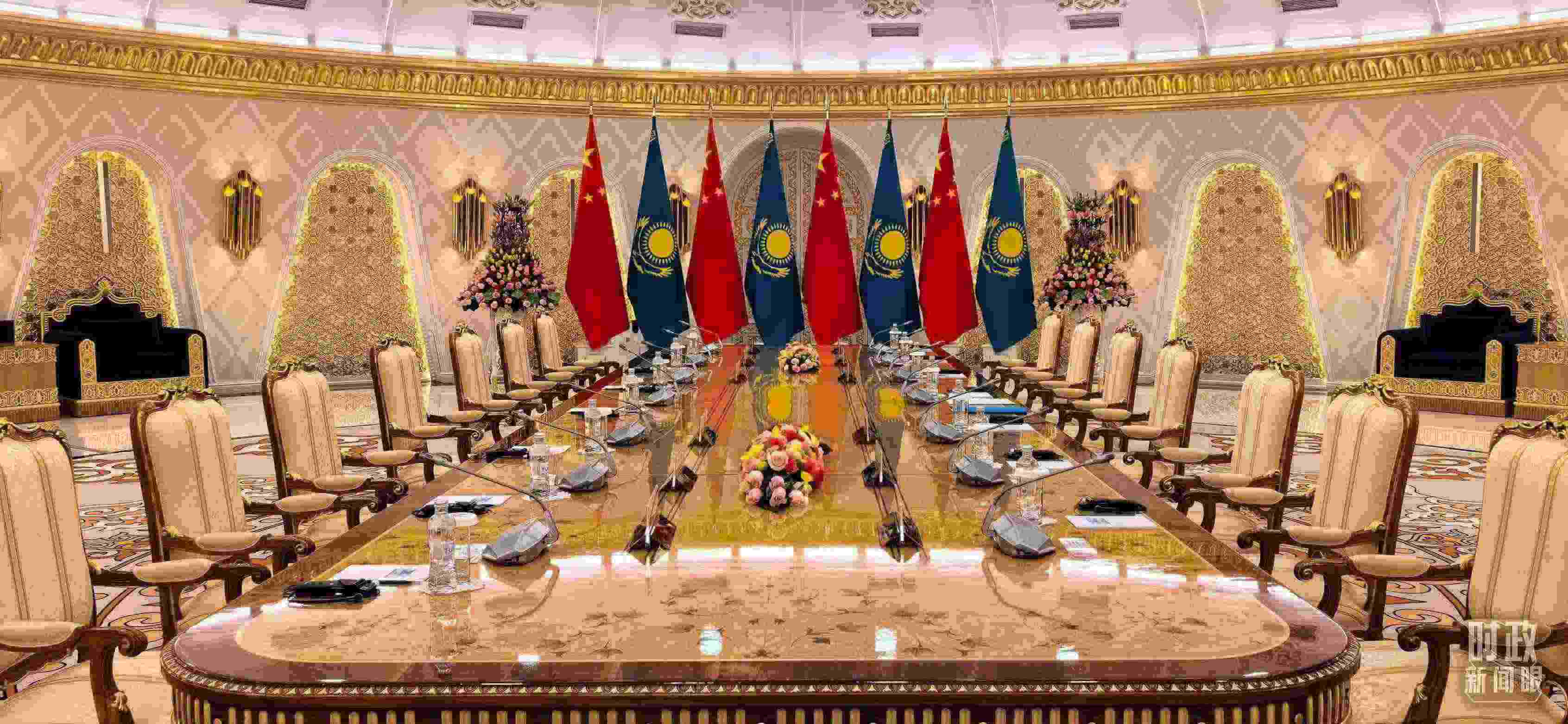 △中哈元首大范圍會談開始前的現(xiàn)場。(總臺央視記者馬超拍攝)