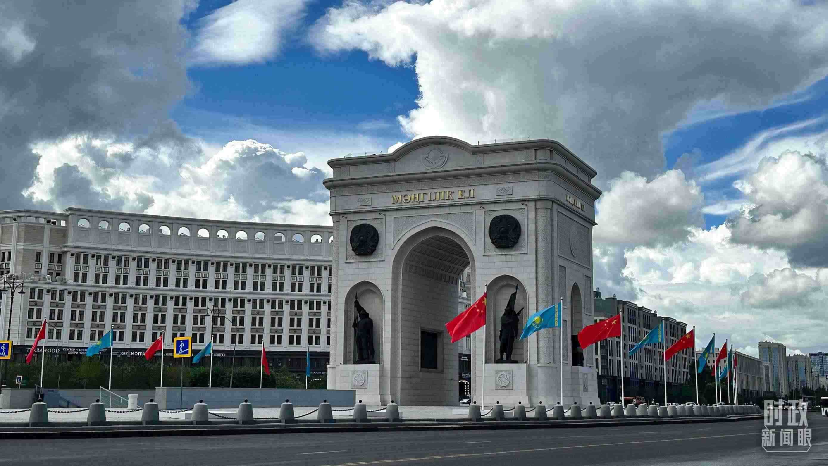 △阿斯塔納地標建筑“凱旋門”兩側(cè),中哈兩國國旗迎風(fēng)招展。(總臺央視記者關(guān)舟拍攝)