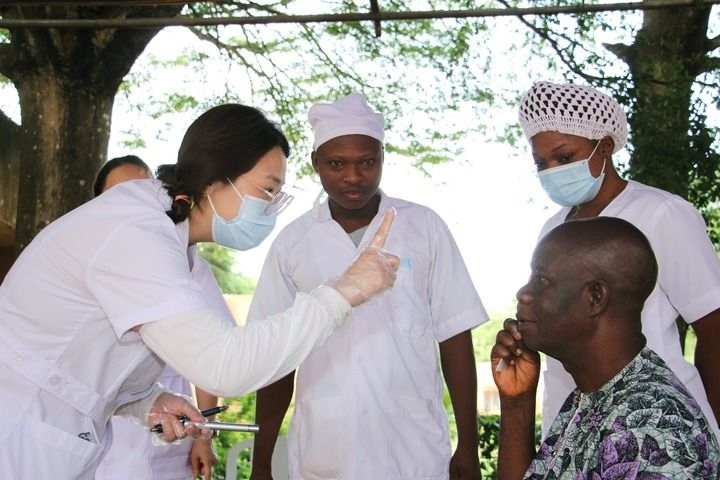 2024年6月6日,在貝寧阿波美中心醫(yī)院,中國第27批援貝寧醫(yī)療隊醫(yī)生為當(dāng)?shù)鼐用窈Y查眼科疾病。新華社發(fā)(塞拉芬攝)