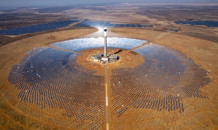這是2024年8月20日在南非北開普省拍攝的南非紅石100兆瓦塔式熔鹽光熱電站項目(無人機照片)。 新華社記者 張譽東 攝